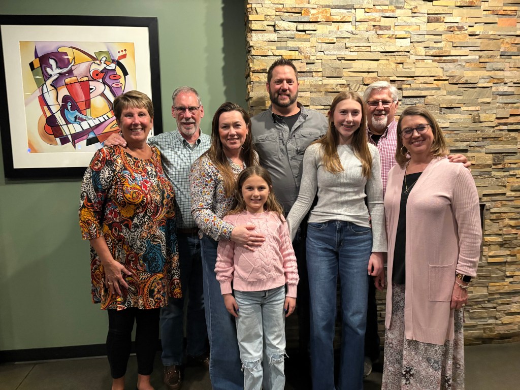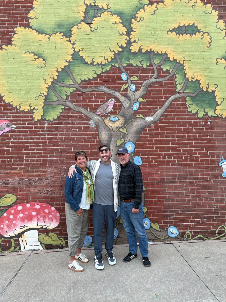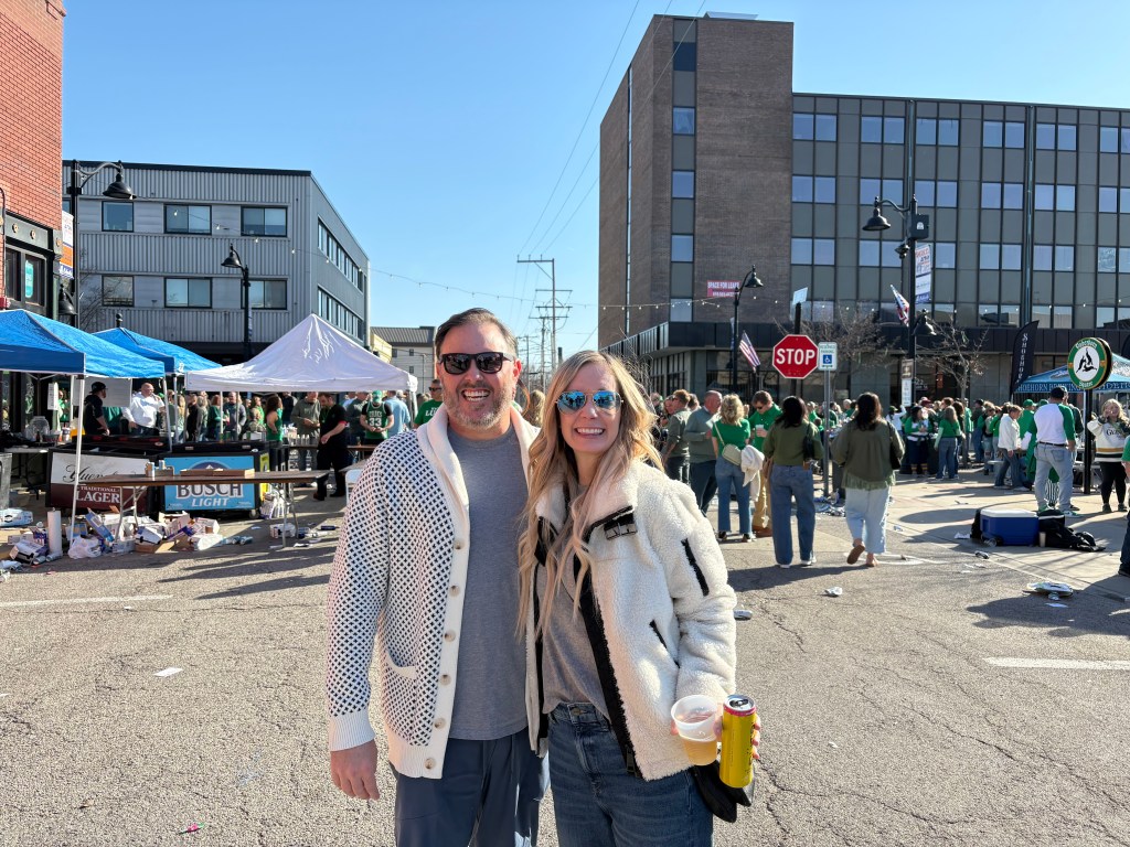 One last story line for this blog and it’s the most important of our journey so far! In 2004, we volunteered to host a college baseball player for our local summer league the Golden Eagles. We ended up taking two young men. Rebecca was away for half the summer with the Univerisity of Hawaii on a small island in Tonga – No electricity or communication – but thats a story for another time. Since Ben never had a brother, we had room, and wanted to fill a gap that Rebeccas absence made, we thought it would be fun to welcome the boys. Both boys were from southern Illinois. We had such a great summer with them. They fit effortlessly into our household. It was wonderful having them with us. Sadly, after 22 years, we had lost contact with them. Amazingly, we managed to reconnect through linkedin and trying an old phone number while we were traveling and we were able to see them both. We spent Friday night having dinner with Joel, his wife and daughters as well as his parents. It was so wonderful hearing about their lives and remembering some of the funny memories that we created that summer. The next day, we met up with Brad, his wife Carolyn and son Brooklyn. Brooklyn is a junior in HS but knows he wants to study meteorology and study storms. He gave us some pointers in case we run into some mid west weather systems, which we did! Thank you Brooklyn! Brad showed us their present community which has been completely revitalized and is now home to cute restaurants, farmers markets, cute shops and a bakery just like the ones we all grew up with! We had lunch at an awesome restaurant that was located in an old factory building. We had a dill pickle pizza and a loaded baked potatoe pizzas – both were awesome! After lunch, they took us to a St. Pattys celebration in the town where he grew up. What a party! I’m not sure if everyone was Irish, but everyone was celebrating like they were. It was so much fun! We were introduced to their best friends, which became our best friends,LOL. Brad was a great ball player and it was like we were walking around with a celebrity. Everybody knew him, which made teasing him all the more fun!
