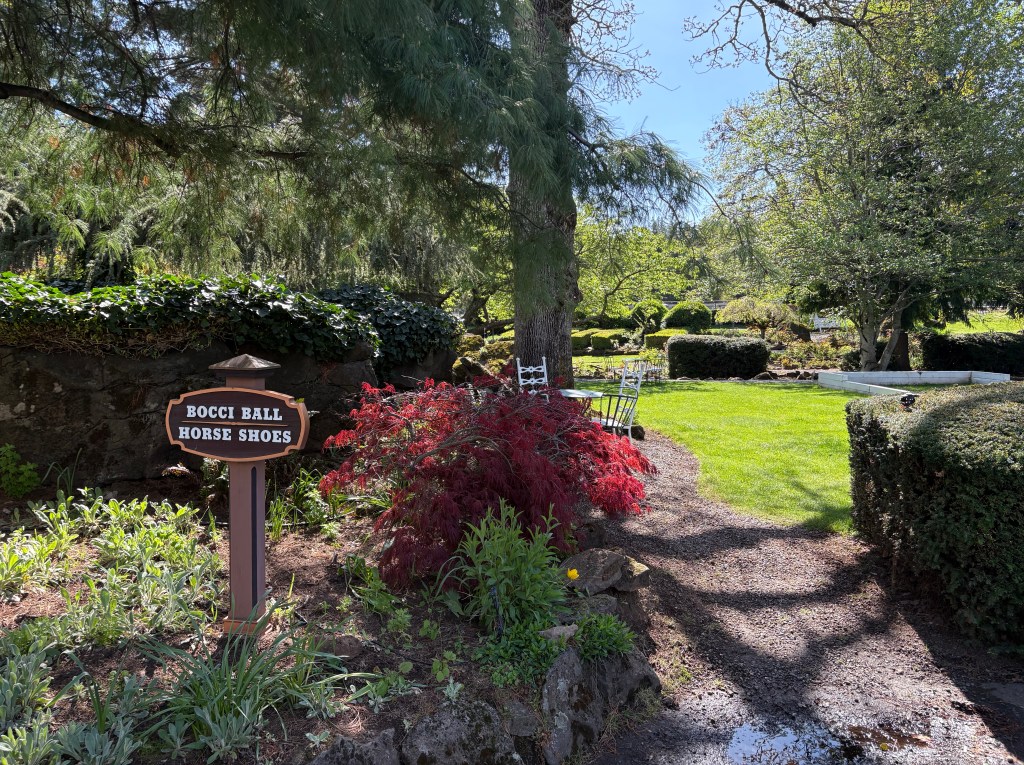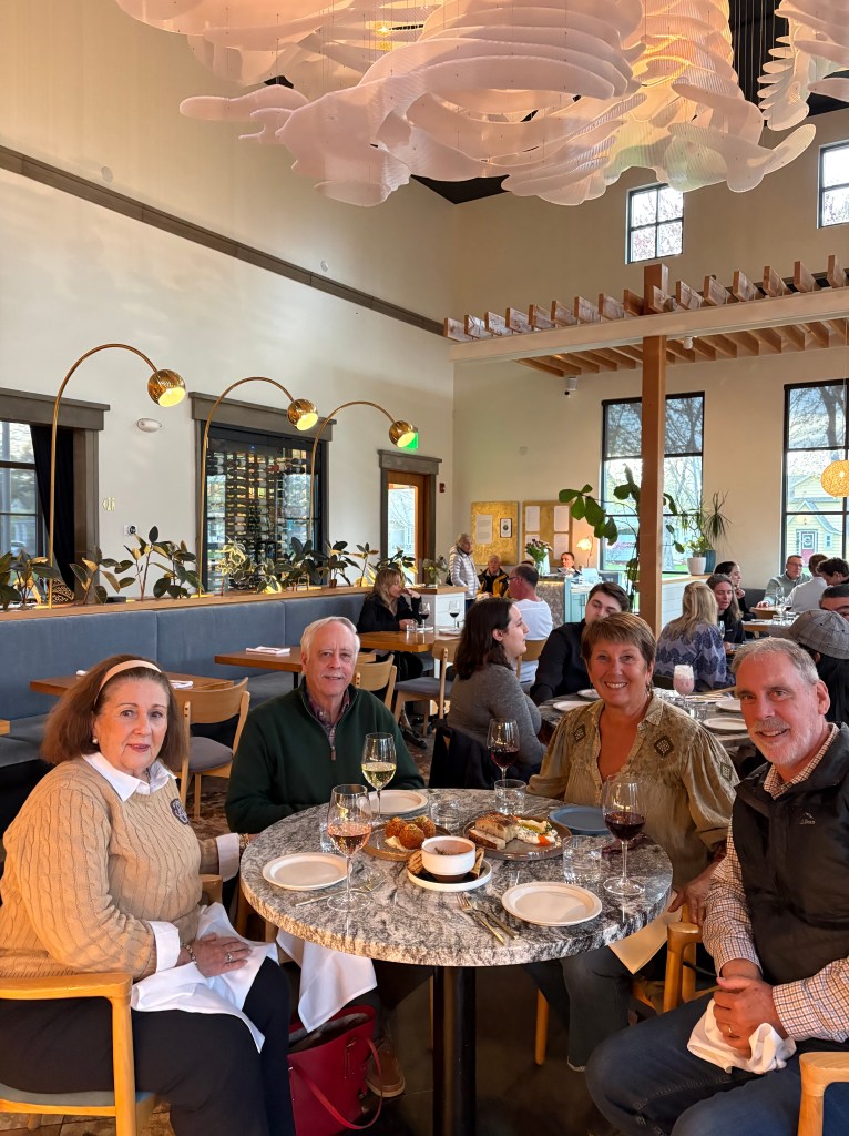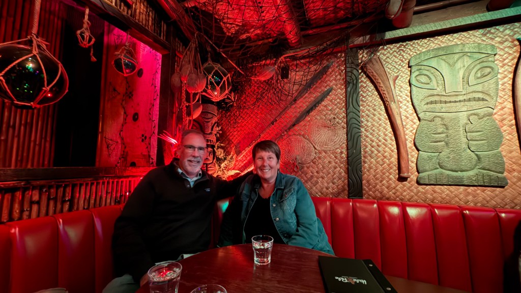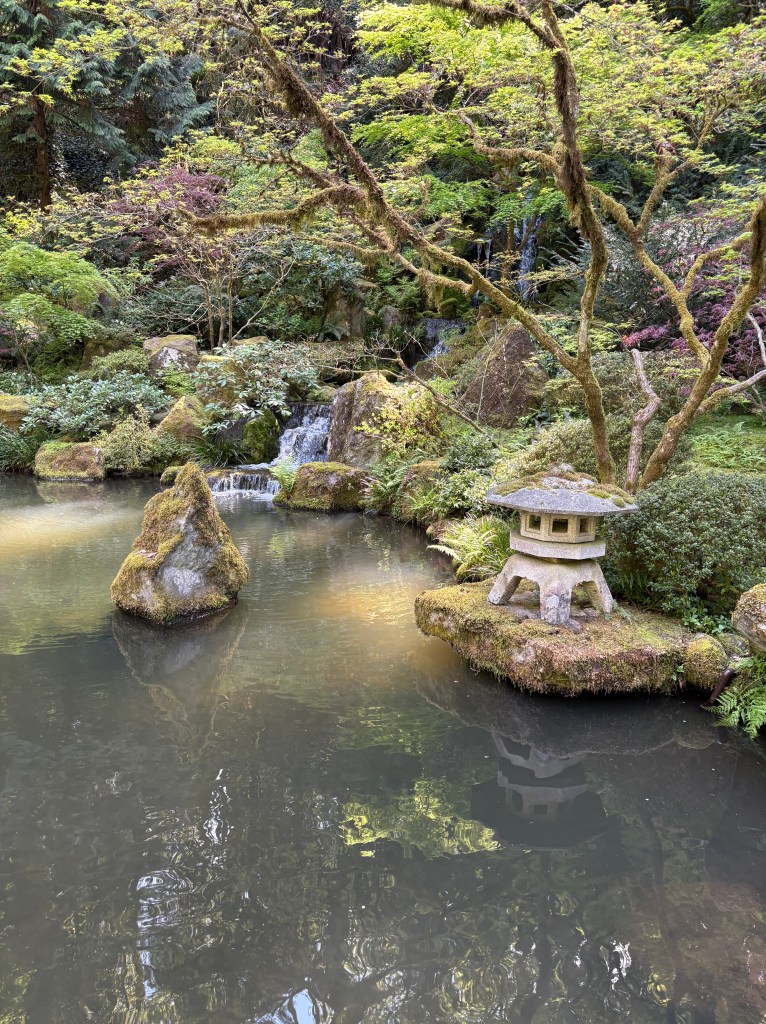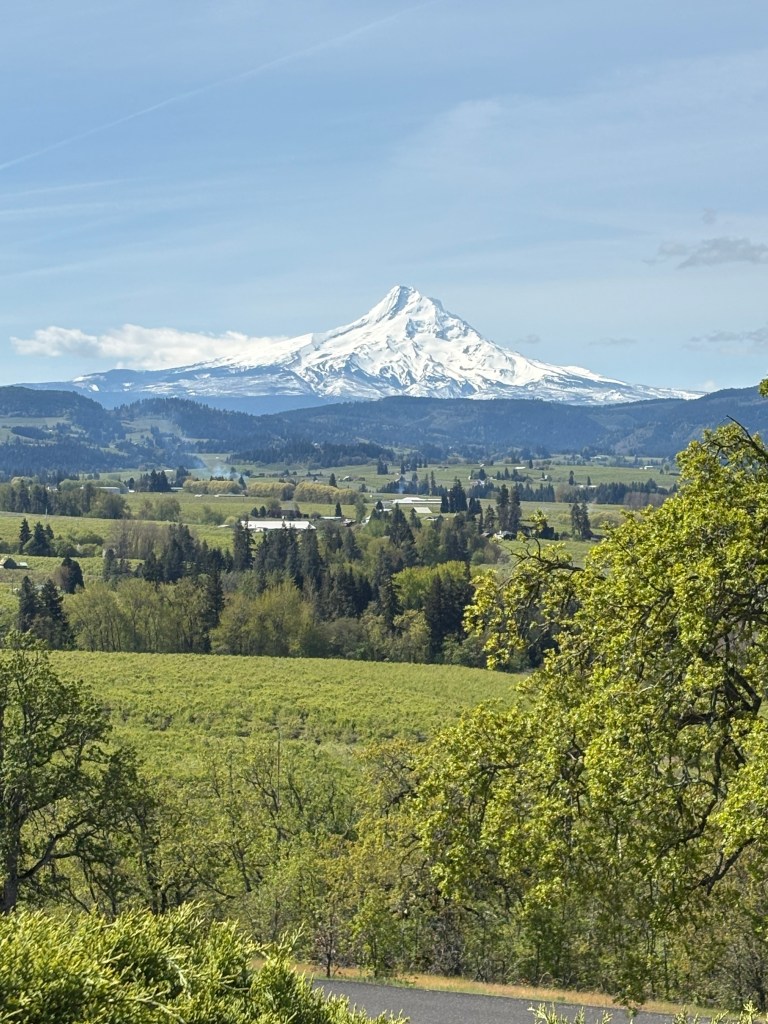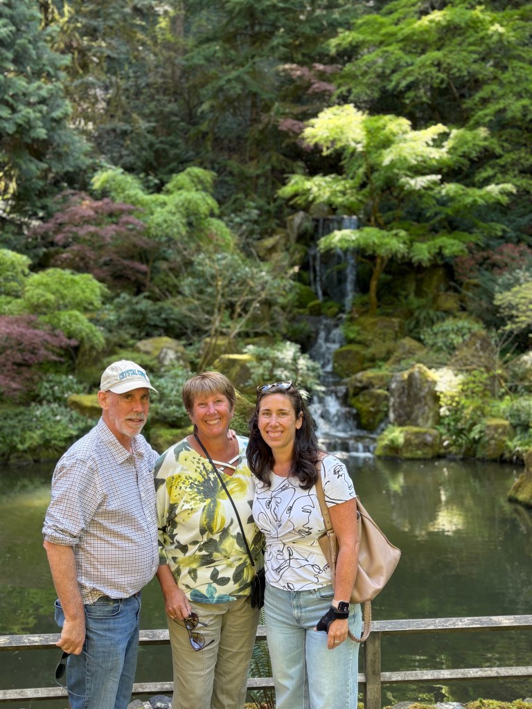 I can’t believe how lucky we have been in 2026! We got to spend a week with Rebecca in Belize at the end of February, a week in early April in southern California and now a 4 day weekend in Portland! We were really willing to help her with some chores around her house, she really wanted to have some fun with us. It started with a great hike at the river with Ruby her dog. Ruby was also a somewhat willing participant in donning a lions hood for a blog photo shoot! We We were able to do a few little yard things that require some extra hands but after that it was a dining and drinking fest! Portland is a foodies paradise and because of its location on the west coast, it is a great place to try wines and some super interesting cocktails. When we were all together in SoCal, she and Ben were talking about Tiki bars. She said hers was legit and she always thinks of my mom when she visits there. Well, she took us there and it did not disappoint! Her cocktail came flaming. There were authentic blowfish lights hanging from the ceiling, wood carvings, a sunken bar, and the perfect background music! The cocktails were delicious! Another interesting place we went was a wine cave. You entered an alley and went into a basement and low and behold, there was a small wine cave with less than 8 tables and 8 bar stools. Super interesting wines to try. We did more than eat and drink, we actually had a great afternoon at the Japanese gardens. It was a warm, blue sky day and the gardens were coming to life. It was a great visit with her and now that we are retired, we can plan to visit her every other month…….just kidding Rebecca! Seriously, We do miss you!