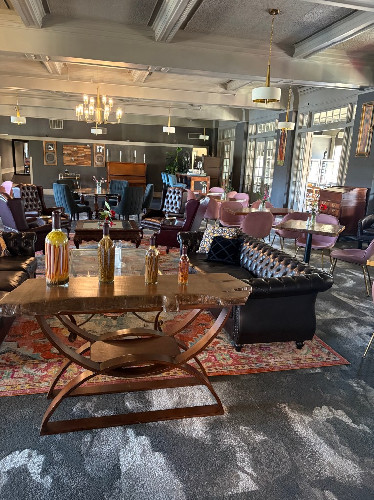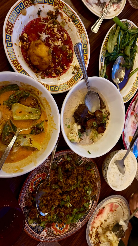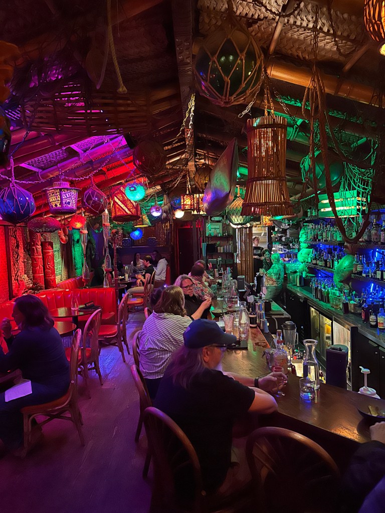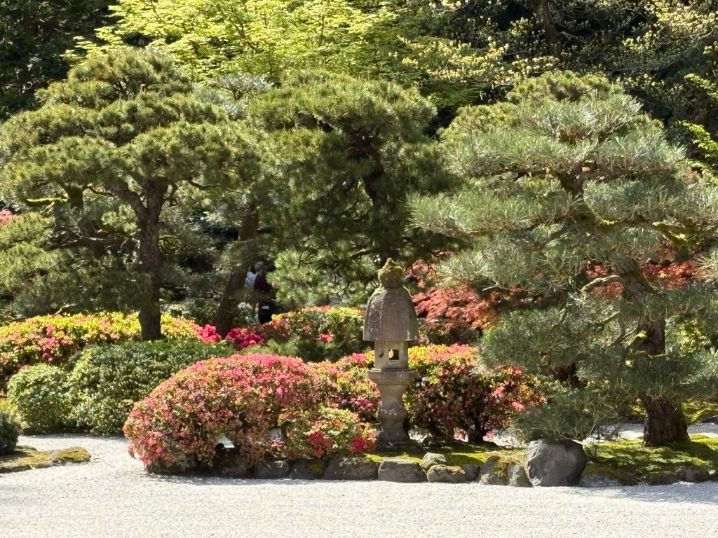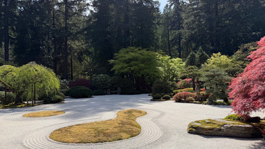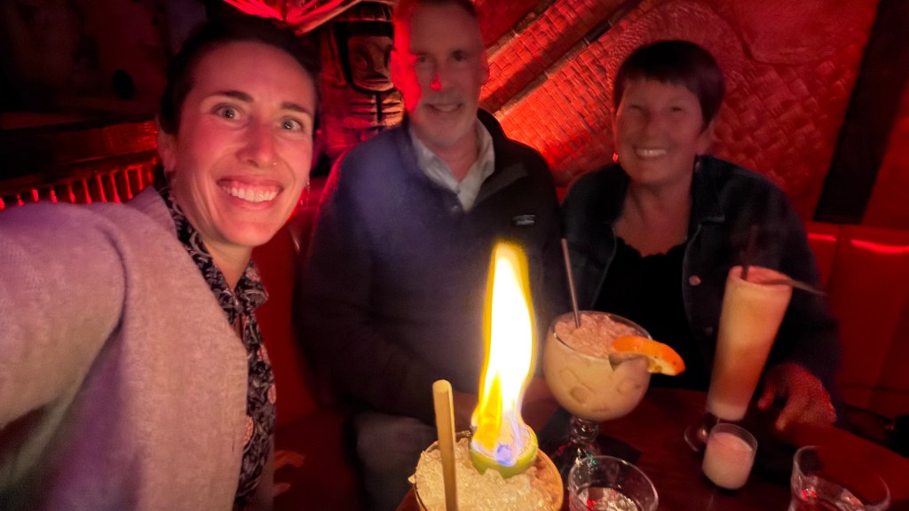 I can’t believe how lucky we have been in 2026! We got to spend a week with Rebecca in Belize at the end of February, a week in early April in southern California and now a 4 day weekend in Portland! We were really willing to help her with some chores around her house, she really wanted to have some fun with us. It started with a great hike at the river with Ruby her dog. Ruby was also a somewhat willing participant in donning a lions hood for a blog photo shoot! We We were able to do a few little yard things that require some extra hands but after that it was a dining and drinking fest! Portland is a foodies paradise and because of its location on the west coast, it is a great place to try wines and some super interesting cocktails. When we were all together in SoCal, she and Ben were talking about Tiki bars. She said hers was legit and she always thinks of my mom when she visits there. Well, she took us there and it did not disappoint! Her cocktail came flaming. There were authentic blowfish lights hanging from the ceiling, wood carvings, a sunken bar, and the perfect background music! The cocktails were delicious! Another interesting place we went was a wine cave. You entered an alley and went into a basement and low and behold, there was a small wine cave with less than 8 tables and 8 bar stools. Super interesting wines to try. We did more than eat and drink, we actually had a great afternoon at the Japanese gardens. It was a warm, blue sky day and the gardens were coming to life. It was a great visit with her and now that we are retired, we can plan to visit her every other month…….just kidding Rebecca! Seriously, We do miss you!